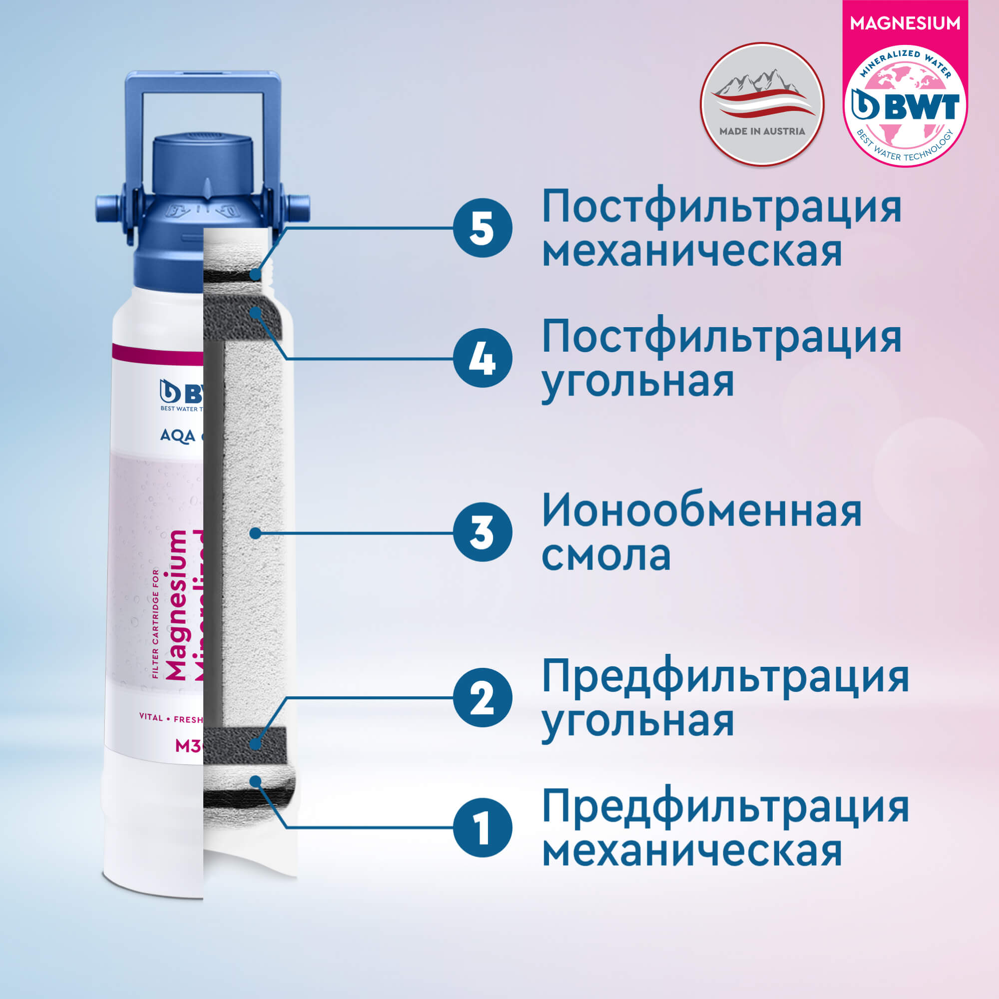 1.Фильтр BWT M - фильтр доочистки питьевой воды с дополнительным обогащением магнием. Без опции умягчения воды.