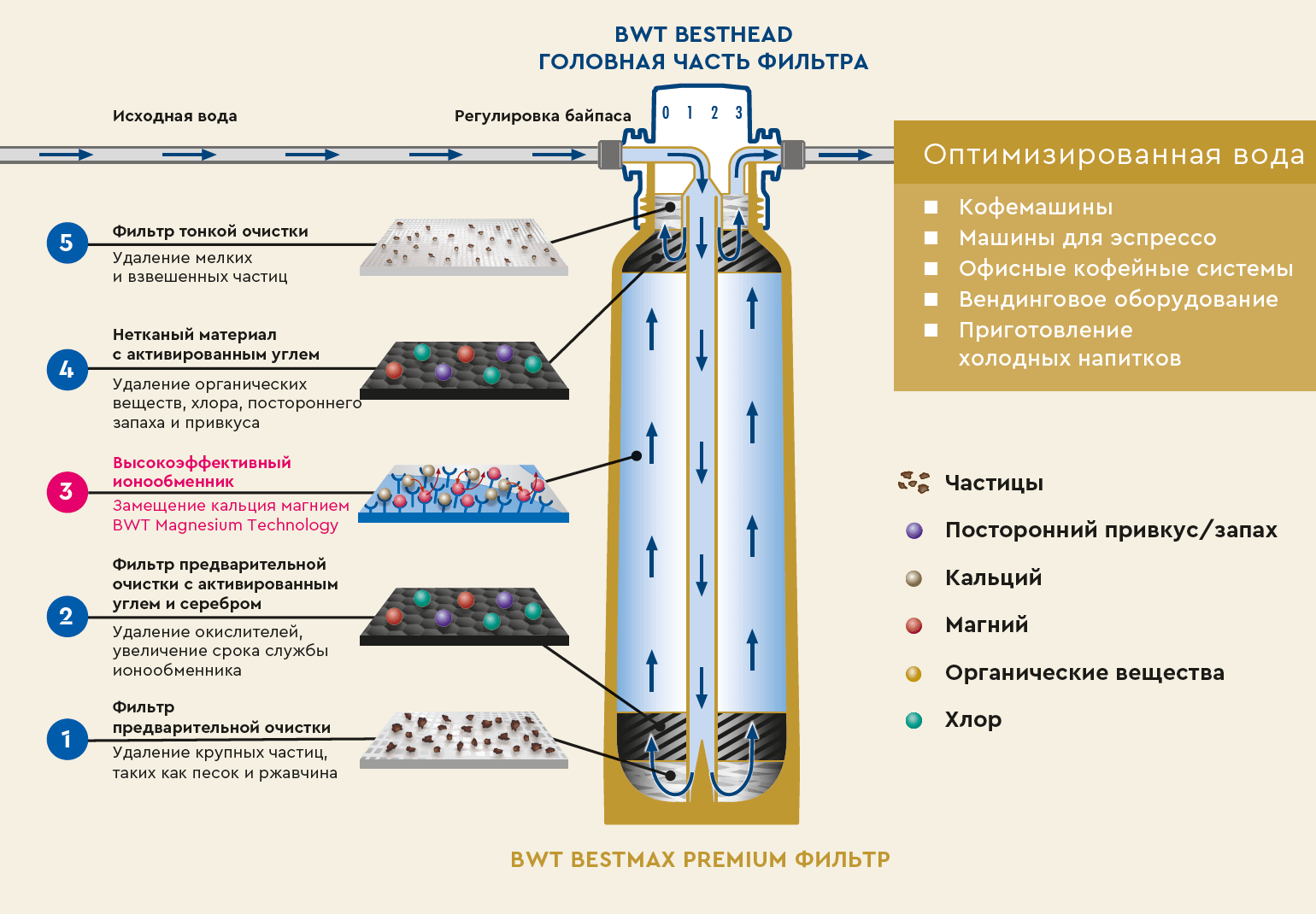 Оптимизированная вода используется для приготовления всех горячих напитков из кофемашин и вендингового оборудования. Данный фильтр удаляет из исходной воды все нежелательные примеси, включая известь, гипс, взвешенные частицы и посторонние привкусы, например хлор и органические соединения.