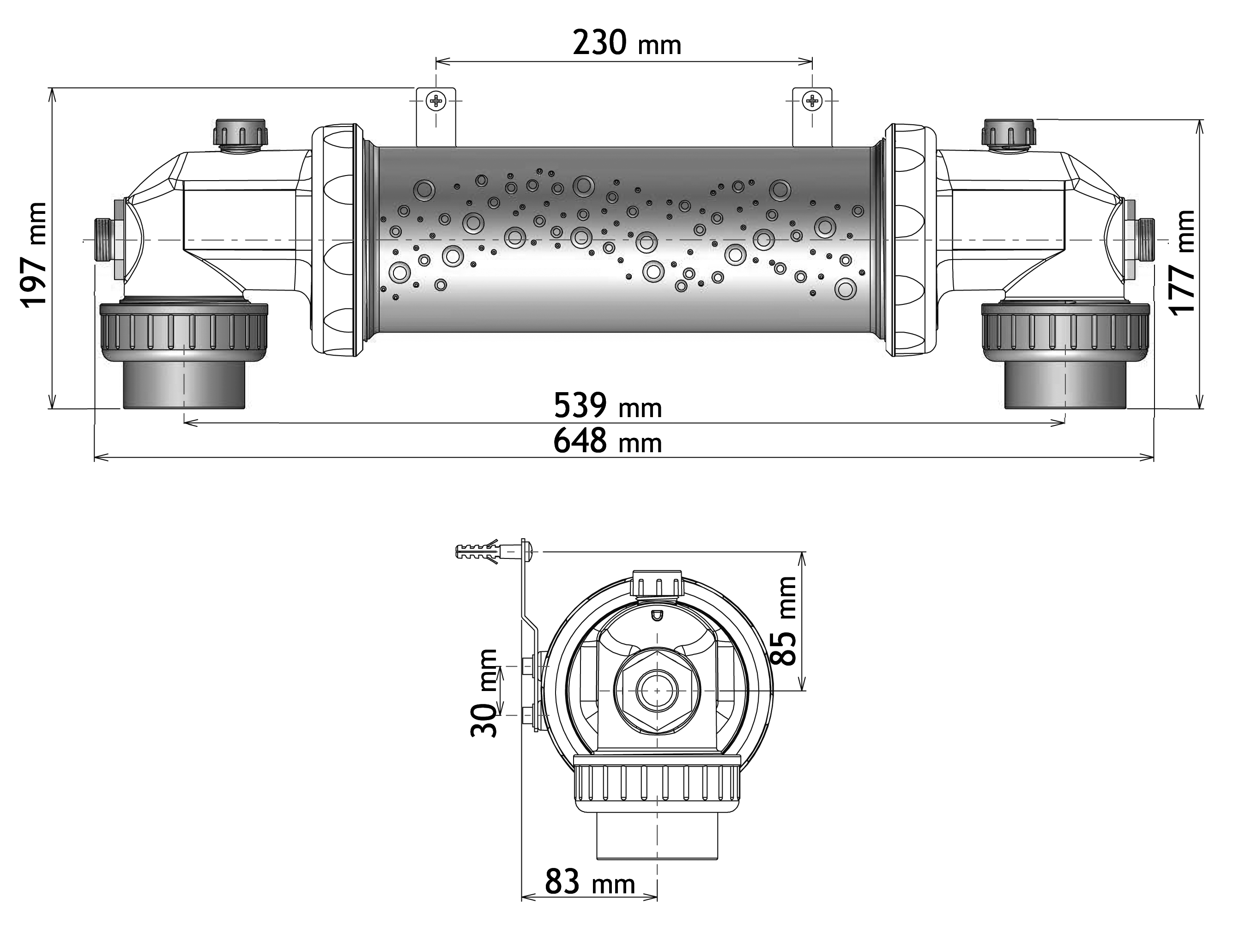 Конструкция предусматривает гильзы для датчиков температуры с обеих сторон и отводы под 90°, что обеспечивает простую интеграцию теплообменника в байпасную линию системы фильтрации.