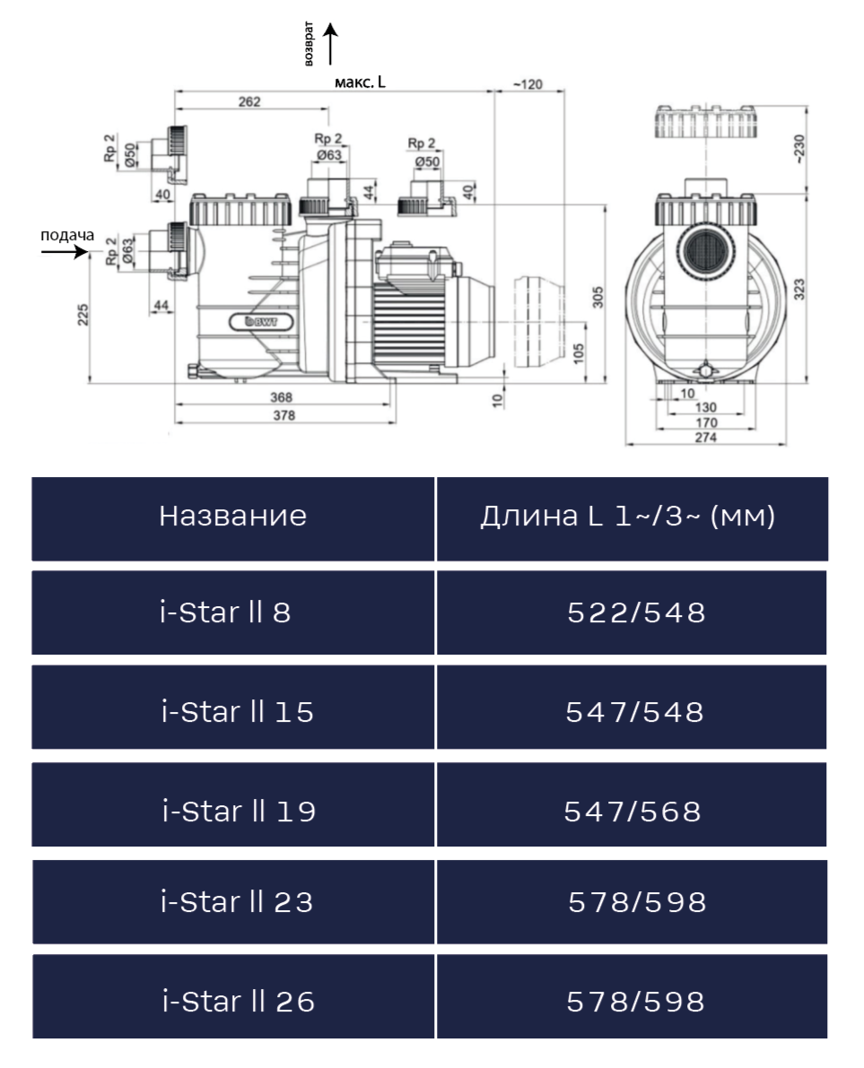 | Модель | Насос для бассейна BWT - i - Star II 8 | Насос для бассейна BWT - i - Star II 15 T | Насос для бассейна BWT - i - Star II 19 T | Насос для бассейна BWT - i - Star II 23 T | Насос для бассейна BWT - i - Star II 26 T |