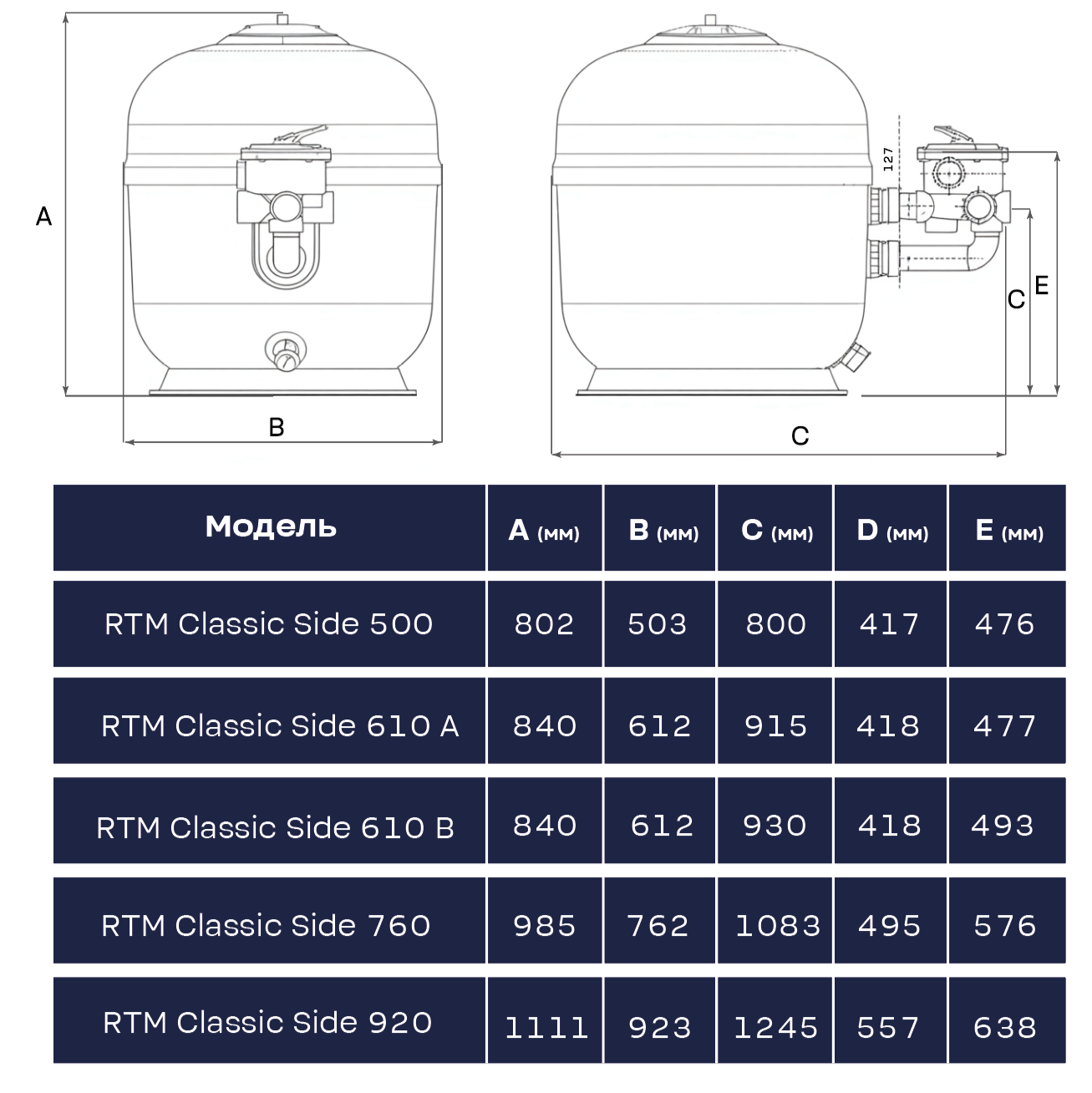 | Модель | RTM Classic Side 500 | RTM Classic Side 610-A | RTM Classic Side 610-B | RTM Classic Side 760 | RTM Classic Side 920 |