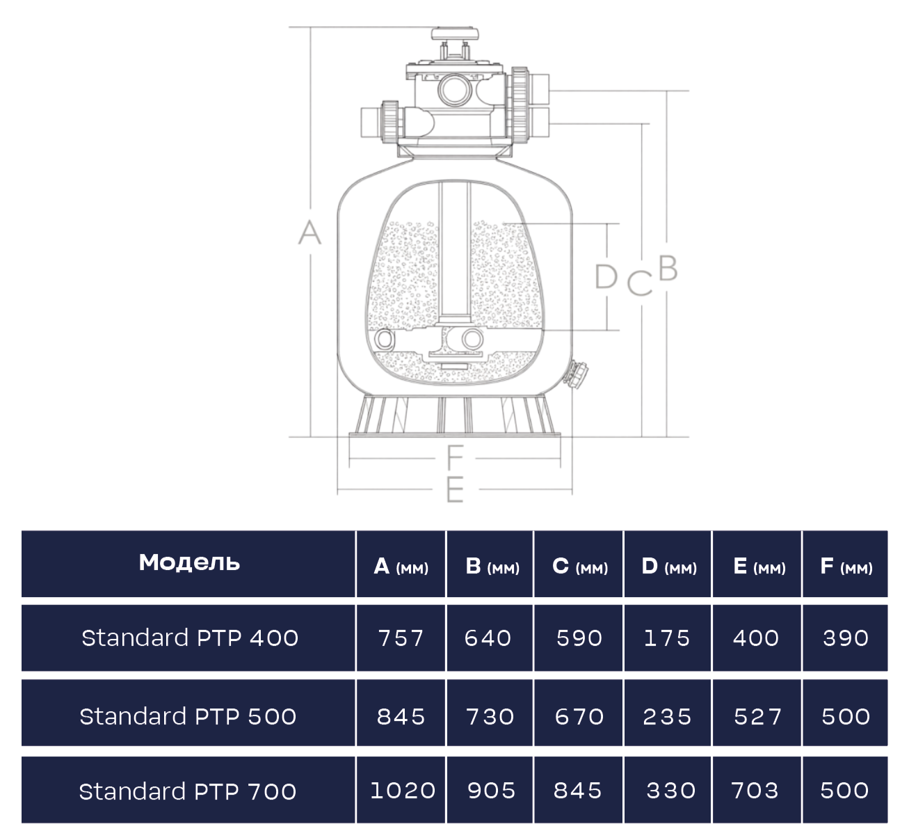 Песочные фильтры Standart PTP с верхним подключением шестипозиционного клапана и корпусом из высокопрочного полиэтилена.