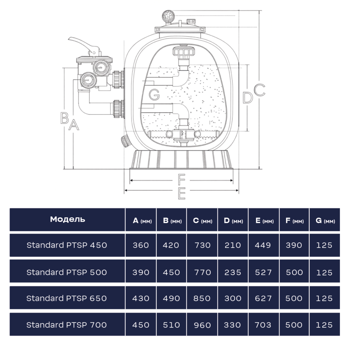 Песочные фильтры Standart PTSP с боковым подключением шестипозиционного клапана и корпусом из высокопрочного полиэтилена.