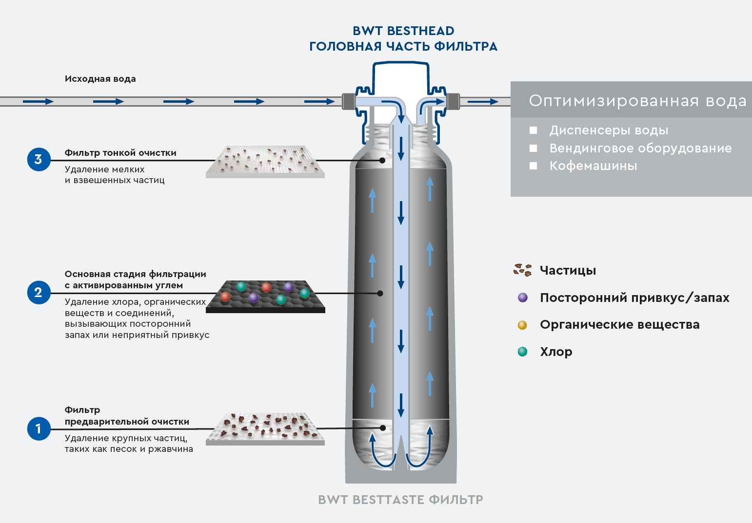 Фильтры BWT Besttaste X / S обеспечивают водой оптимального органолептического качества. Любые присутствующие взвешенные твердые частицы и неприятный привкус или запах надежно устраняются, гарантируя идеальный вкус. Вода приобретает превосходные органолептические свойства.