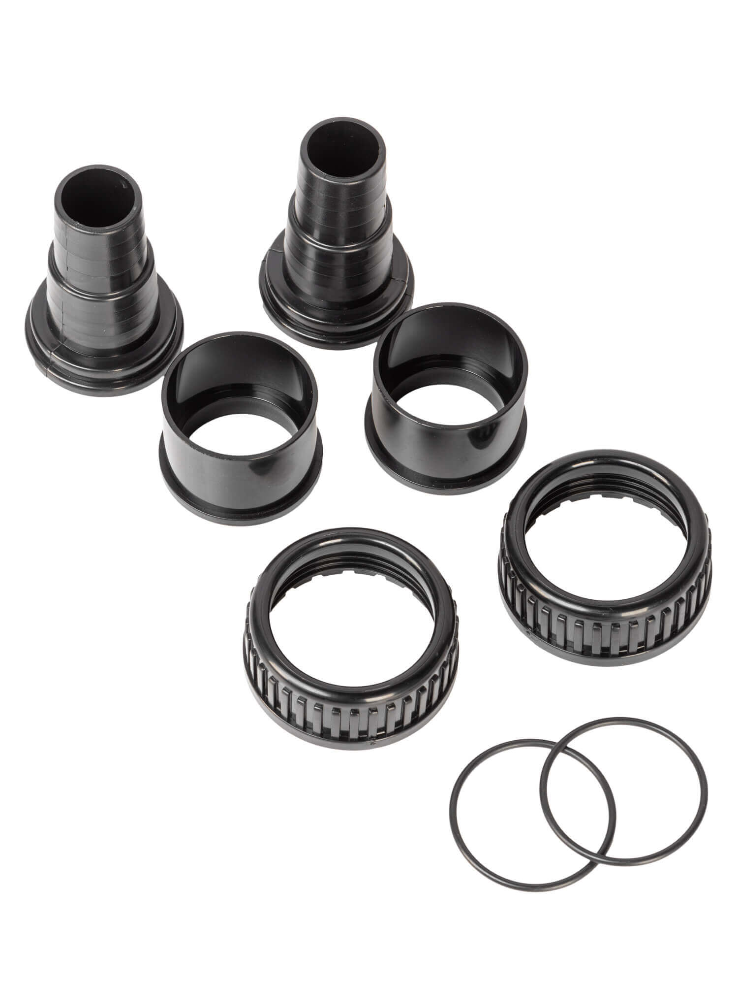 Насос поставляется в комплекте с двумя типами соединений: штуцерами для шлангов Ø 32/38 мм и муфтами под клеевое соединение Ø 50 мм. Это предоставляет гибкость при монтаже и подключении к различным типам гидравлических контуров.