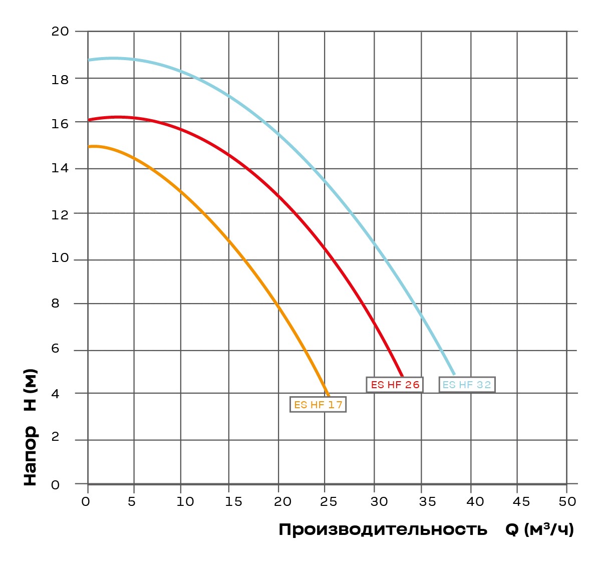 Производительность серии: от 17 до 32 м³/ч (в зависимости от модели) при напоре воды 10 метров.