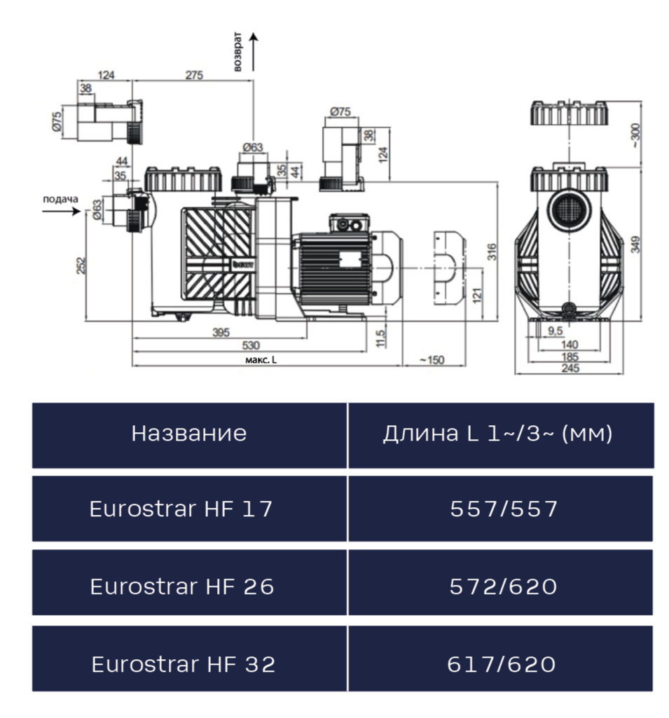 | Модель | Насос для бассейна BWT Eurostar HF 17 T,S | Насос для бассейна BWT Eurostar HF 26 T | Насос для бассейна BWT Eurostar HF 26 M | Насос для бассейна BWT Eurostar HF 32 T |